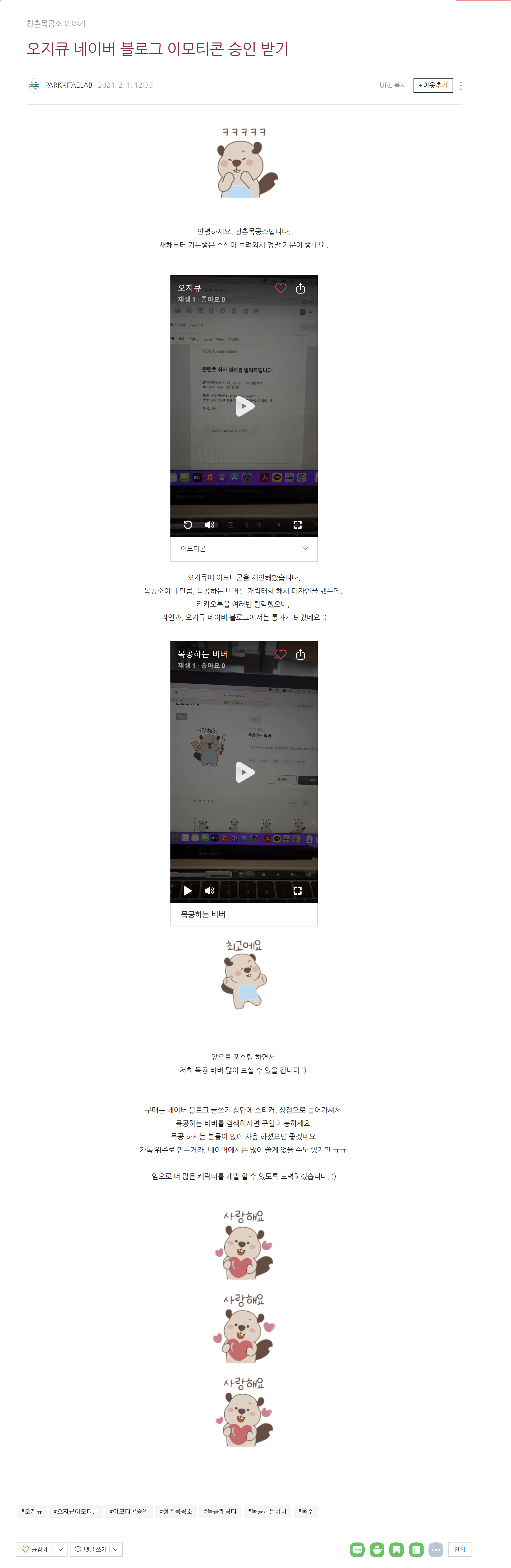 청춘목공소 캐릭터 이모티콘, 라인-오지큐 승인!